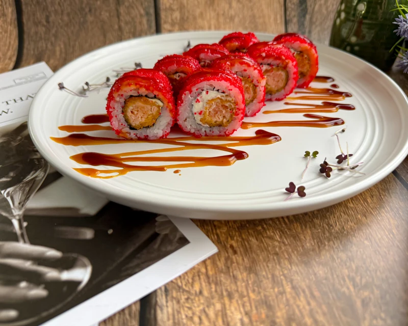 рис, нори, лосось темпура, сыр творожный, икра Масаго, соус Унаги, соус Лемонграсс Комплектация: соевый соус 50мл, васаби 10г, имбирь 15г