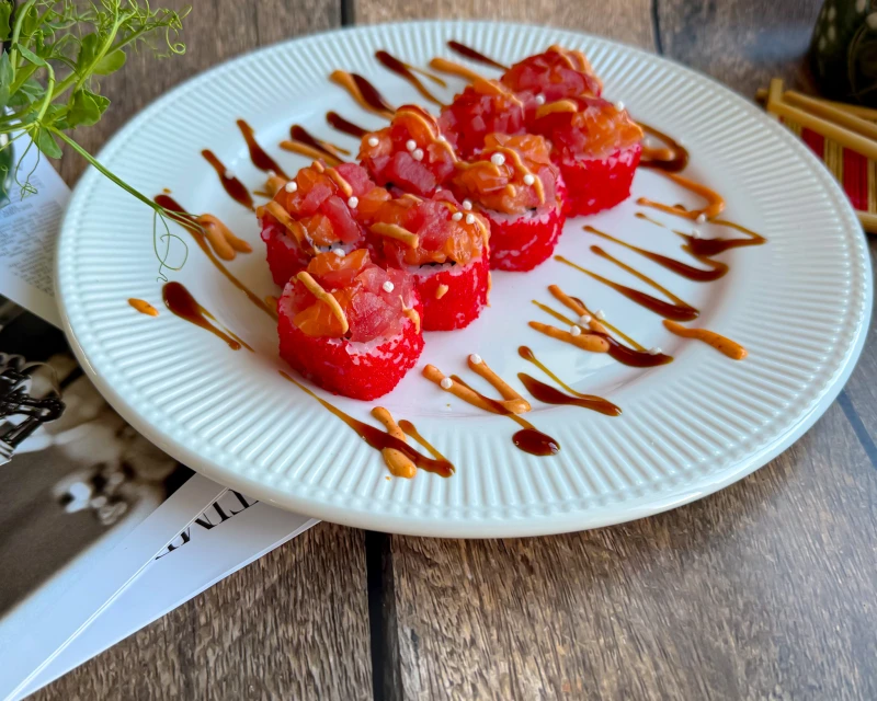 рис, нори, огурец, сыр творожный, икра Масаго, тунец, лосось, соус Спайси, соус Унаги, рисовые шарики Комплектация: соевый соус 50мл, васаби 10г, имбирь 15г
